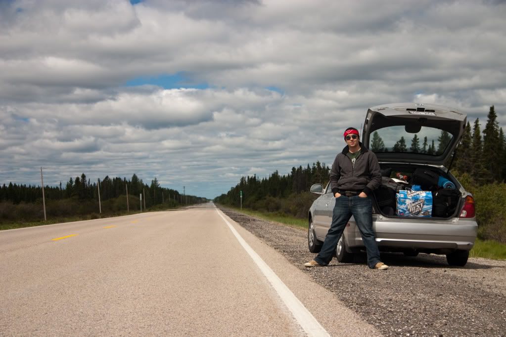 Comme de fait, nous arrivons au Manitoba, il est 10 h 45. Pardonnez-moi, il est 9 h 45 maintenant. Nous avons réussi à passer au travers de la plus pénible des provinces en une seule journée. Le soleil est sur le point de tomber, on doit absolument trouver une place ou piquer la tente et se coucher pour continuer la route demain. Après avoir pris quelques photos, on rembarque dans la voiture et on trouve un lac pas trop loin de la frontière. Le temps de trouver l’endroit rêvé, il fait déjà noir. Phil décide de prendre la voiture et nous emmène ou l’on va pouvoir dormir. Je pense que J-S s’en foutait puisqu’il dormait déjà. J’ai décidé de l’imiter.